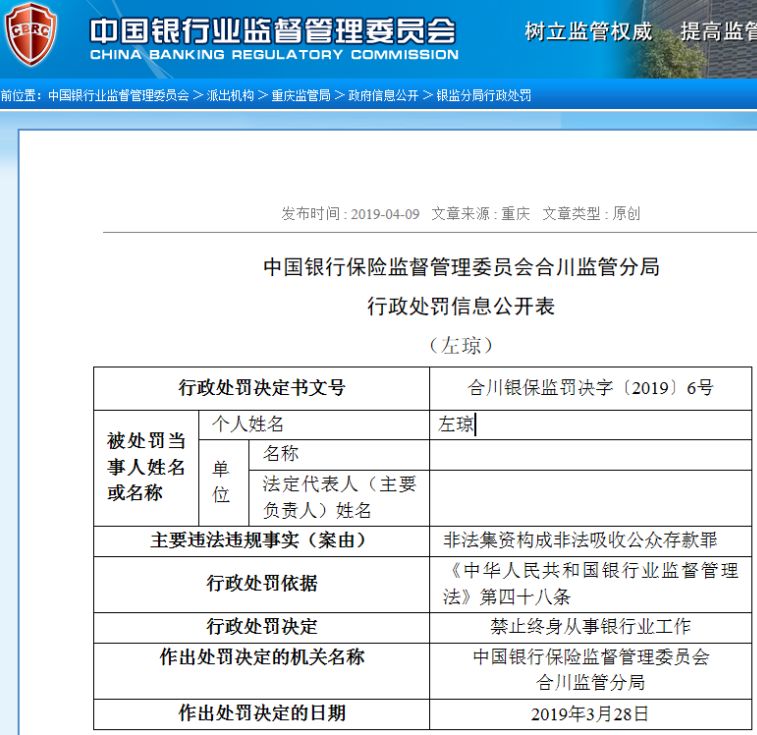 罚单显示,左琼因非法集资构成非法吸收公众存款罪,被罚禁止终身从事银行业工作。根据重庆市第一中级人民法院2016年的一份刑事裁定书显示,2008年以来,左琼在未经有关部门依法审批的情况下,承诺以月利率1%至4%为回报,通过杨某、梁某等多人以口口相传的方式向社会公众散播信息,以借款的形式向102名被害人吸收存款共计6242.68万元,并将存款还本付息和高息借款给他人。至案发时,左琼已返还2323.55万元,尚有3919.13万元无力归还。