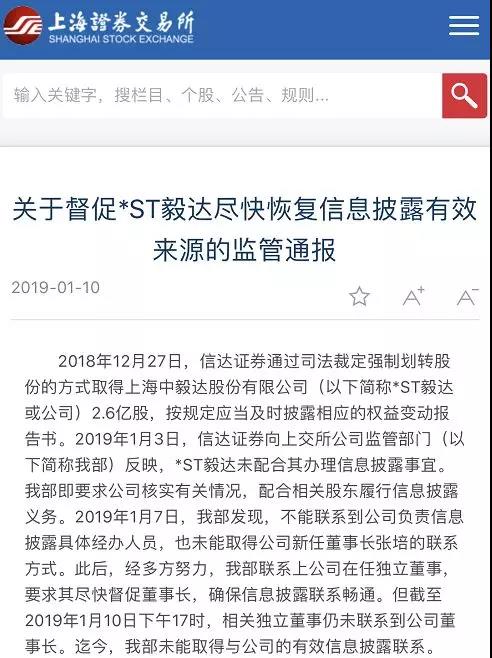 2018年12月27日,信达证券通过司法裁定强制划转股份的方式取得*ST毅达2.6亿股,按照规定,应当及时披露相应的权益变动报告书,上交所昨日晚间发布的《关于督促*ST毅达尽快恢复信息披露有效来源的监管通报》(简称《通报》)显示,*ST毅达既没有配合信达证券办理信息披露事宜,上交所还不能联系到公司负责信息披露具体经办人员,也未能取得公司新任董事长张培的联系方式。