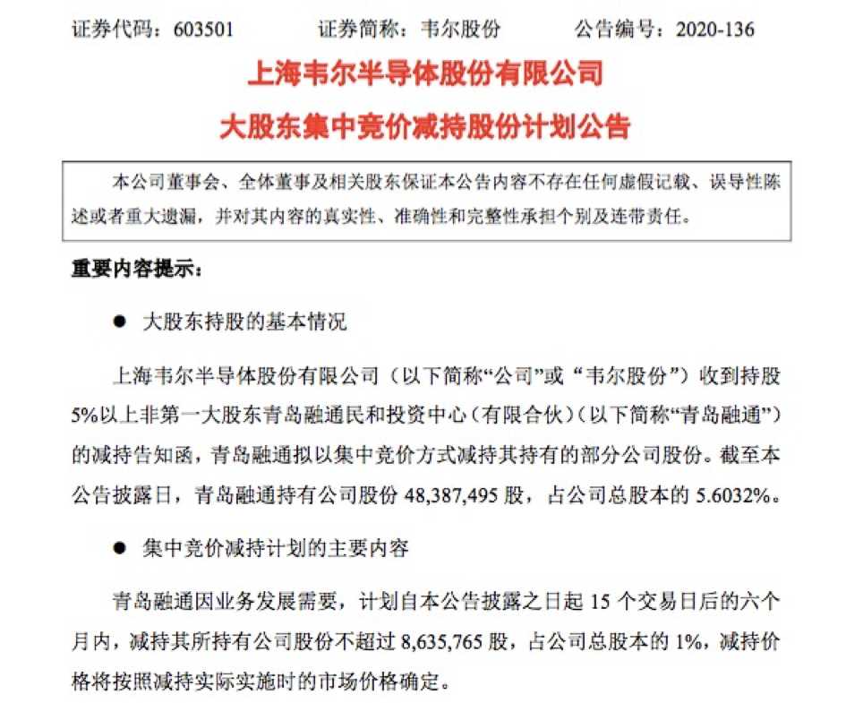 就股价闪崩的原因看,很可能是受到了大股东减持的影响。就在10日晚上,韦尔股份曾发布公告称,持股5.6032%的大股东青岛融通因业务发展需要计划减持公司股份863.58万股,占总股本的比例不超过1%。按11日的收盘价估算,减持金额超过17亿元。