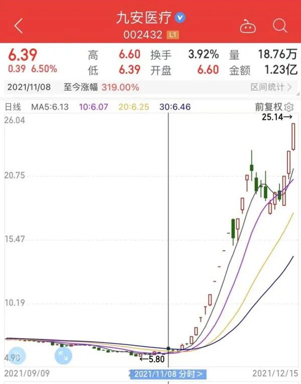 这一消息成为公司股价上涨的“助燃剂”。从11月8日的6.39元开始,九安医疗股价一路直线上涨,截至今日,报收于25.14元/股,累计涨幅达到293.43%。