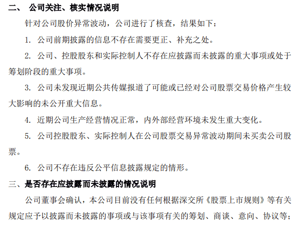 监管函指出,公司股价自11月15日起连续9个交易日涨停,至11月25日累计涨幅136.18%,期间公司三次披露《股票交易异常波动公告》称不存在应披露而未披露信息。公司直至11月26日才在《股票交易风险提示公告》中就前述互动易答复内容进行风险提示,直至11月30日才在《关于深圳证券交易所关注函回复的公告》中就前述互动易答复内容进行披露及进行必要的解释说明和风险提示。