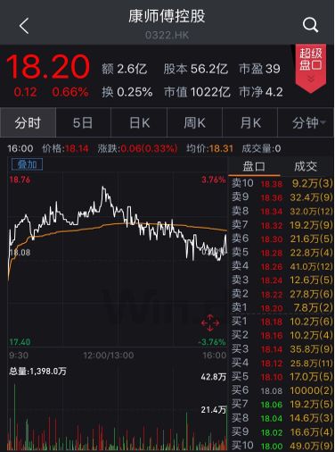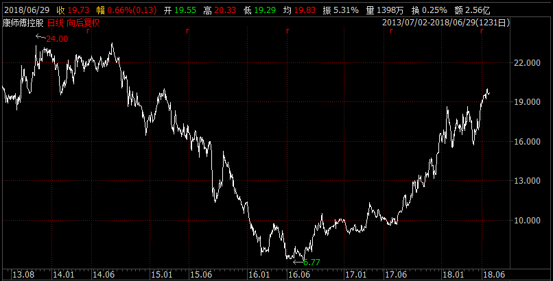 截至7月2日收盘,康师傅控股股价收于18.2港元,市值再次回到千亿港元上方,最新总市值1022亿港元。