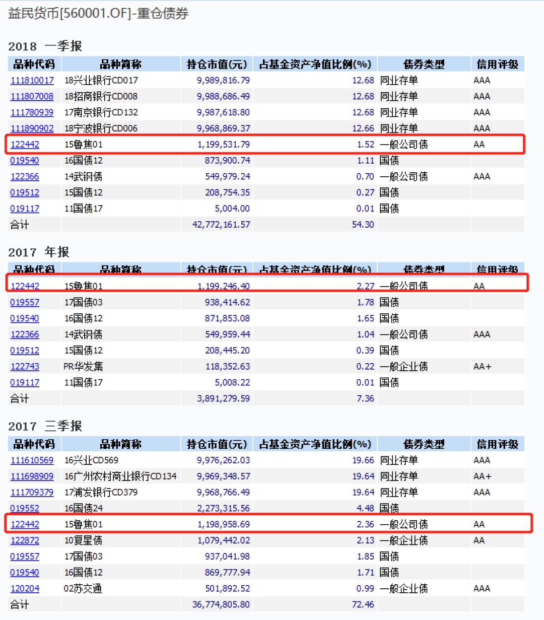 不过,在2017年年报中,15鲁焦01曾占据第一重仓债的位置,占比一度达到2.27%。