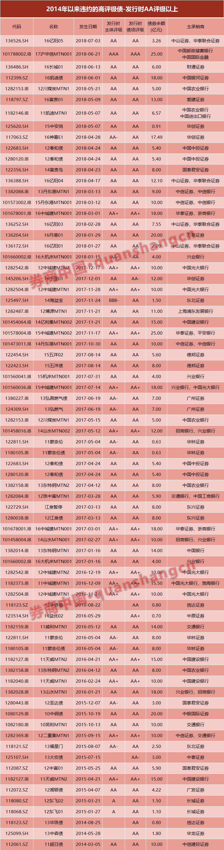 如放宽统计范围至2014年以后,据券商中国记者统计,在2014年以来发生的183起违约事件中,有74起违约事件的债券曾拥有AA及AA以上评级,有17起违约事件的债券曾拥有AA+和以上评级。