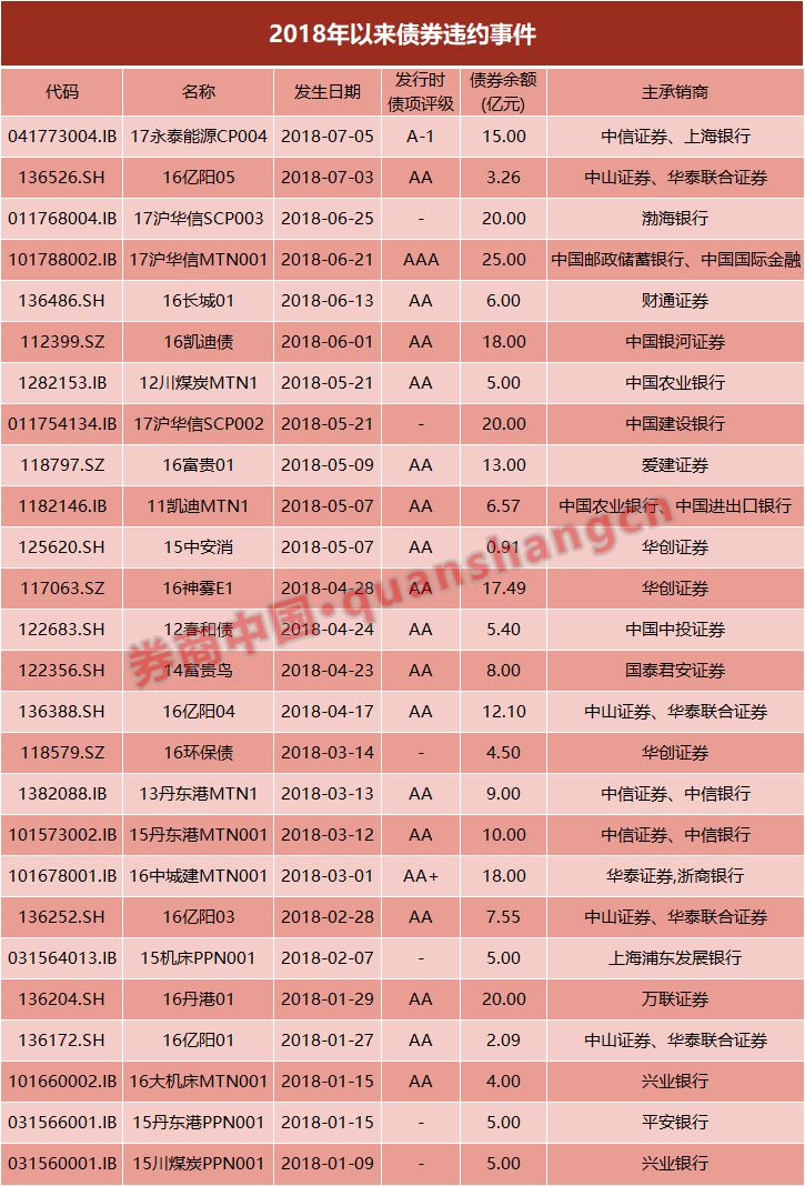 最近的例子是,2018年6月21日,17沪华信MTN001发生违约,截至2018年6月21日,公司未能筹集到期付息资金,“17沪华信MTN001”不能按期支付利息,构成实质性违约,而该债券在发行时曾拥有AAA评级,发行主体上海华信国际集团也拥有AAA评级。