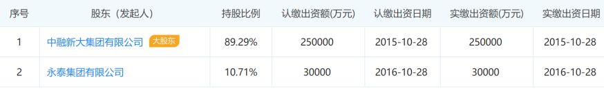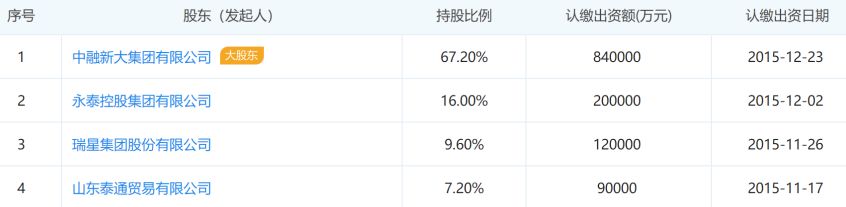 中融金控(青岛)集团工商信息显示,公司拥有4名股东,其中中融新大为第一大股东,出资84亿元、持股67.2%,永泰控股集团出资20亿元、持股16%,二者的出资日期均为2015年12月。