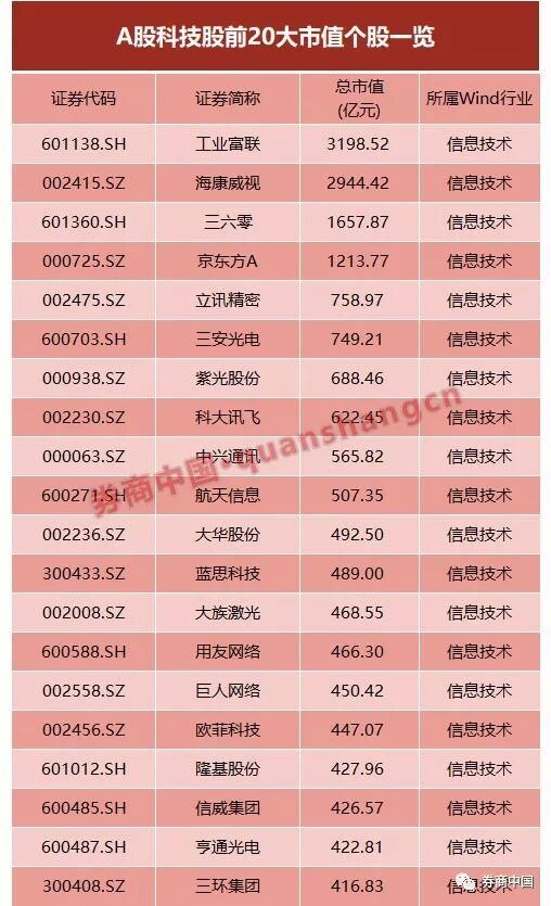 再来看A股科技股(信息技术板块),目前市值最大的是近期刚刚上市的工业富联,市值不足3200亿;位居第二的是海康威视,市值不足3000亿;位居第三的是美股私有化后借壳上市的三六零,市值仅1600亿左右。整体来看,市值超过1000亿元的科技股也仅4只。