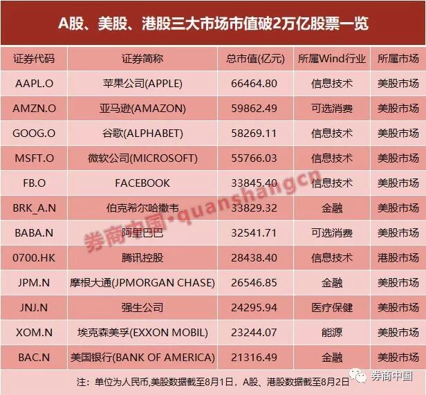 据券商中国记者统计,A股、港股和美股三大市场中,市值突破2万亿人民币的股票共有12只,分别是苹果公司、亚马逊、谷歌、微软公司、FACEBOOK、伯克希尔哈撒韦、阿里巴巴、腾讯控股、摩根大通、强生公司、埃克森美孚、美国银行。