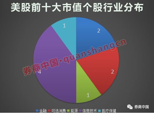 从美股前十大市值个股行业分布来看,信息技术板块(即科技股)共有4只,占绝对优势;金融板块和可选消费板块各有2只,能源和医疗保健板块各1只。结构分布较为合理。