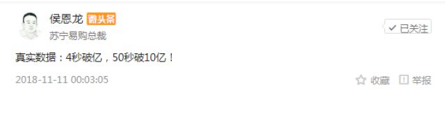 11月11日凌晨,苏宁易购发布双十一实时战报:成交额4秒破亿,50秒破10亿。