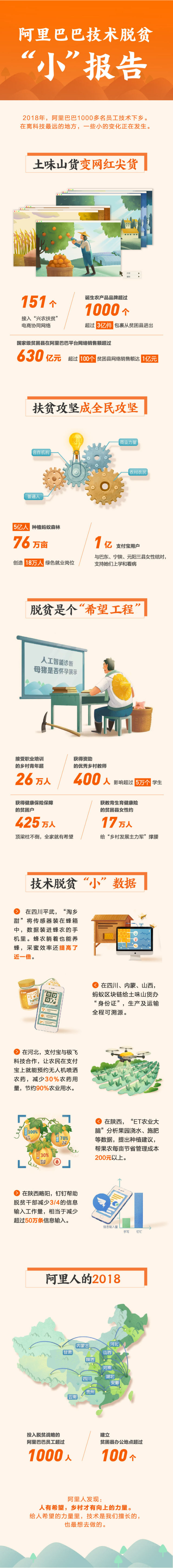 阿里巴巴10日发布脱贫基金年报显示,技术正在成为企业探索脱贫的新模式,工程师成为脱贫攻坚中坚力量。报告显示,过去一年时间里,有数百名阿里工程师带技术下乡,全国600多个贫困村通过电商脱贫成为了淘宝村,国家级贫困县在阿里平台的销售额超过630亿元,其中,超过100个贫困县网络销售额超过1亿元。此外,蚂蚁森林在沙漠植树 76万亩,创造了18万人次的绿色就业岗位。