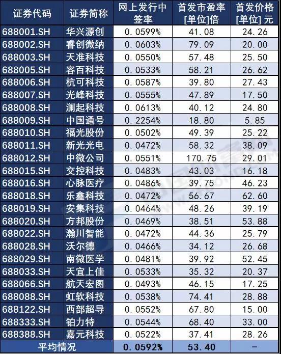 回顾科创板首批上市的25只股票的基本情况。从来看中签率方面,科创板首批上市发行的股票网上发行中签率平均值为0.0592%,中签概率最高的中国通号(688009)为0.2254%,最低的安集科技(688019)为0.0464%。