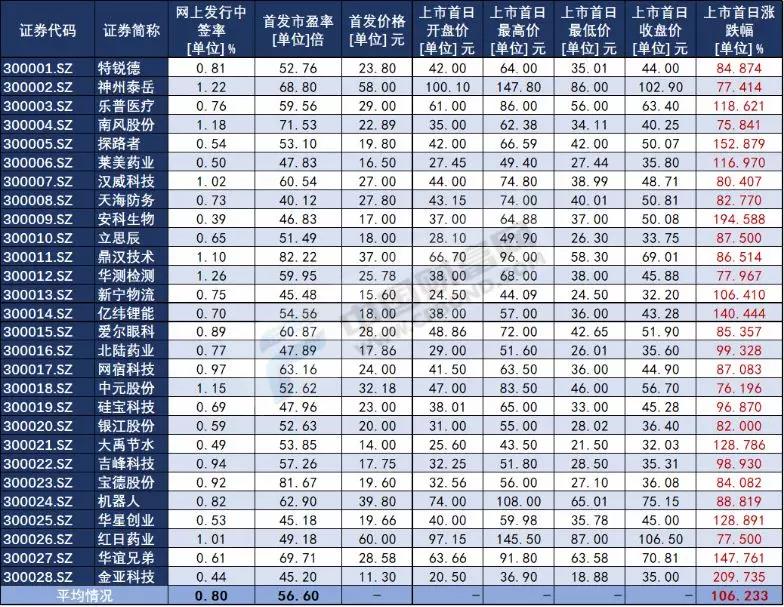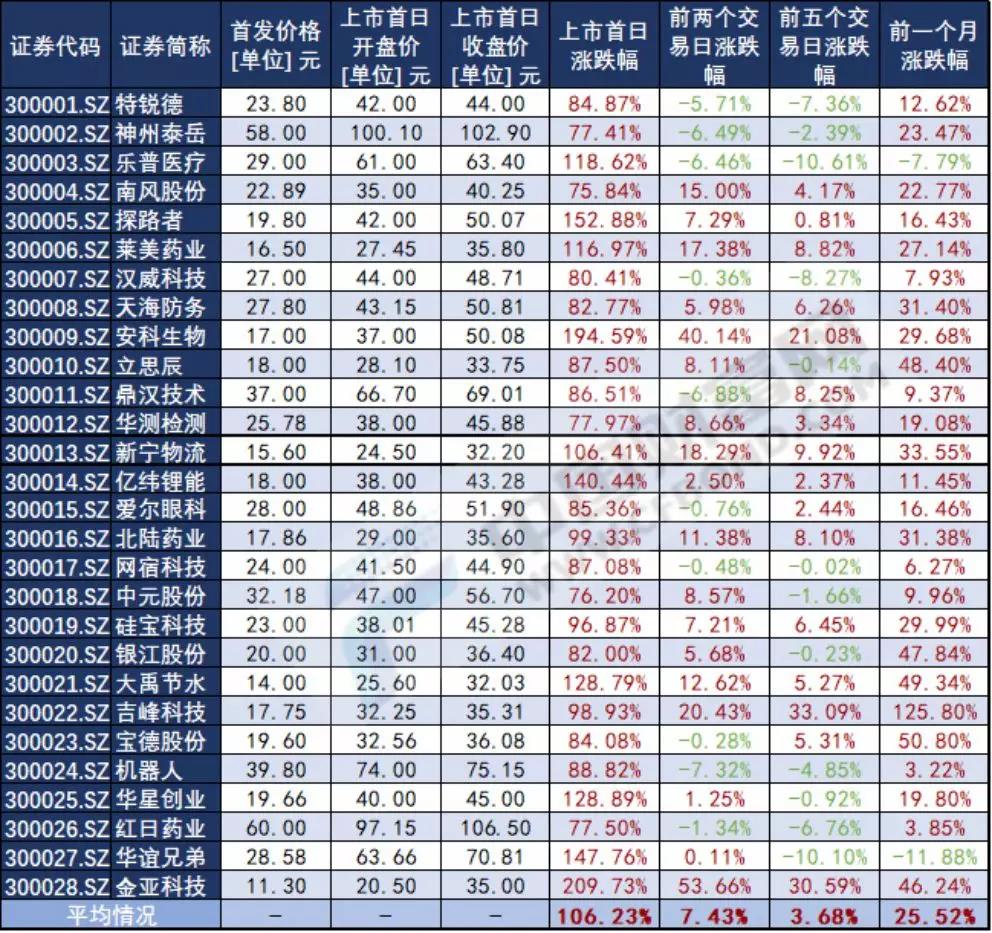 用个股首发价格和当日收盘价计算,28家创业板新股上市首日股价平均上涨106.23%,其中金亚科技(300028)、安科生物(300009)和探路者(300005)涨幅排名前三,分别上涨209.73%、194.59%和152.88%;涨幅最小三只个股分别是神州泰岳(300002)、中元股份(300018,曾用名:中元华电)和南风股份(300004),虽说涨幅最小,但其个股股价涨幅也在75%以上。