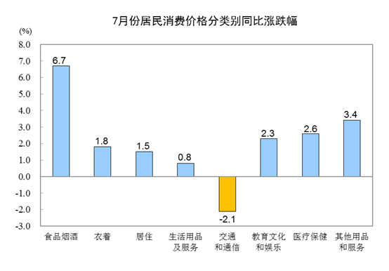 7月份,食品烟酒价格同比上涨6.7%,影响CPI(居民消费价格指数)上涨约1.95个百分点。其中,鲜果价格上涨39.1%,影响CPI上涨约0.63个百分点;畜肉类价格上涨18.2%,影响CPI上涨约0.75个百分点(猪肉价格上涨27.0%,影响CPI上涨约0.59个百分点);鸡蛋价格上涨11.4%,影响CPI上涨约0.06个百分点;禽肉类价格上涨7.6%,影响CPI上涨约0.09个百分点;鲜菜价格上涨5.2%,影响CPI上涨约0.12个百分点;粮食价格上涨0.6%,影响CPI上涨约0.01个百分点。