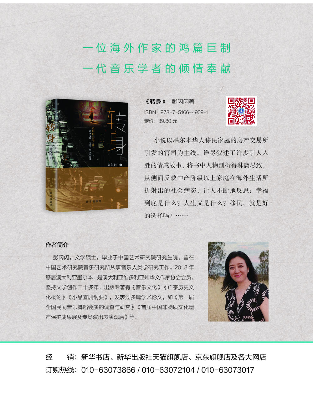 一来一往间,他们不仅将华侨华人在外的经历体现在字里行间中,而且也充当了多元文化的记录使者。其中海外华人作家彭闪闪就是其中的一名使者,日前,她的新作——以中产阶级以上海外移民家庭生活为创作背景的长篇小说《转身》正式出版发行。