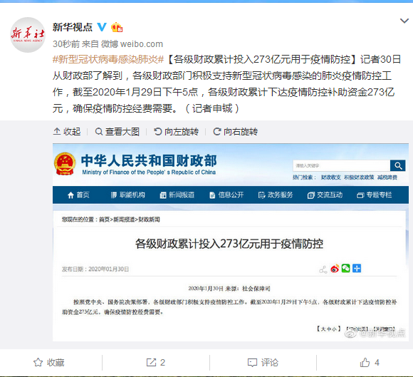 记者30日从财政部了解到,各级财政部门积极支持新型冠状病毒感染的肺炎疫情防控工作,截至2020年1月29日下午5点,各级财政累计下达疫情防控补助资金273亿元,确保疫情防控经费需要。