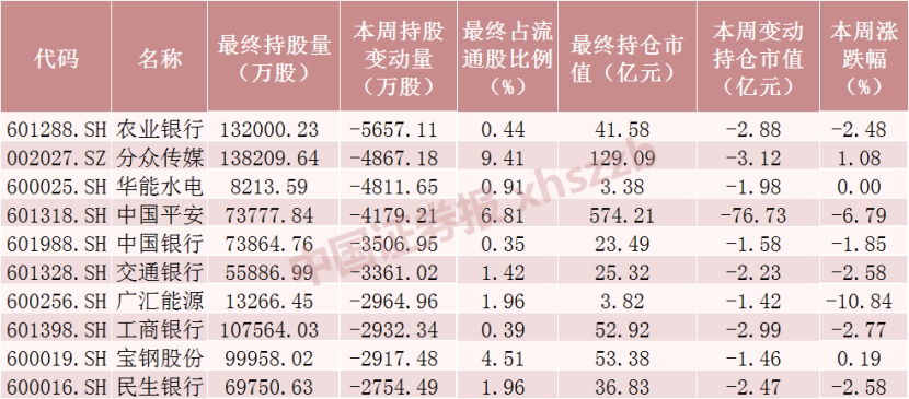截至10月30日,北向资金持仓市值1.95万亿元,本周北向资金持仓市值增加62亿元。本周北向资金共计减仓864只个股,对其中45只个股的减仓股数超过1000万股。减仓股数位居前三的农业银行、分众传媒、华能水电被分别减仓5657.11万股、4867.18万股、4811.65万股,此外北向资金对中国平安、中国银行、交通银行的减仓股数超3000万股。