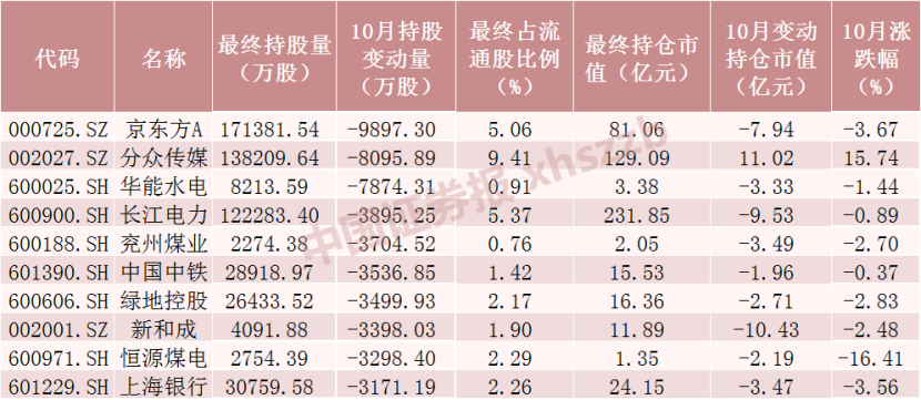 Choice数据显示,10月北向资金共计减仓911只个股,对其中76只个股的减仓股数超过1000万股。减仓股数最多的京东方A被减仓9897.30万股,此外分众传媒、华能水电被分别减仓8095.89万股、7874.31万股。