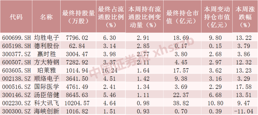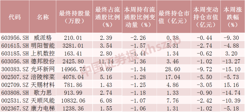从持有流通股比例情况来看,本周北向资金对10只个股的持有流通股比例减少1个百分点以上,对威派格、明阳智能、上机数控持有流通股比例减少居前,分别减少2.26、1.57、1.44个百分点。