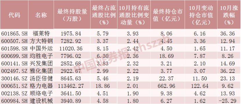 从持有流通股比例情况来看,Choice数据显示,10月北向资金对26只个股的持有流通股比例增加超过1个百分点,其中对福莱特、方大特钢、中国外运持有流通股比例增加居前,分别增加3.93、2.44、2.42个百分点。