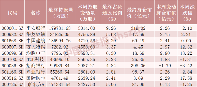 Choice数据显示,本周北向资金共计加仓577只个股,对34只个股的加仓股数超过1000万股,加仓股数最多的平安银行被加仓5014.00万股,此外加仓华菱钢铁、中国建筑、方大特钢超4000万股,显示了北向资金对低估值股的布局。