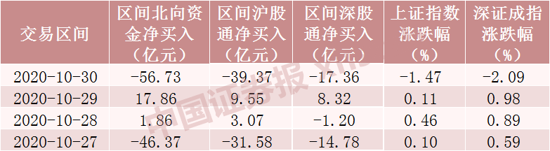 因重阳假期影响,10月26日沪股通和深股通暂停交易,因此本周北向资金仅有四个交易日,累计净流出金额超80亿元。Choice数据显示,10月27日北向资金净流出46.37亿元,10月28日净流入1.86亿元,10月29日净流入17.86亿元,10月30日净流出56.73亿元。