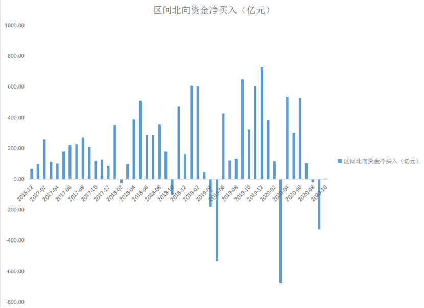 整个10月,北向资金累计净流入0.23亿元,其中沪股通资金净流出16.09亿元,深股通资金净流入16.32亿元。10月北向资金的变动金额为沪、深股通开通以来月度最低水平。10月,北向资金对613只个股加仓,对911只个股减仓。