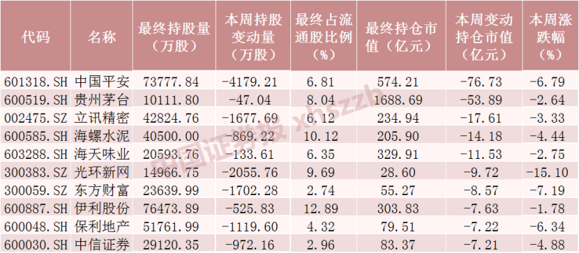 从持仓市值变动情况来看,本周北向资金对17只个股的持仓市值减少超过5亿元,对中国平安、贵州茅台、立讯精密持仓市值减少金额居前,分别减少76.73亿元、53.89亿元、17.61亿元。