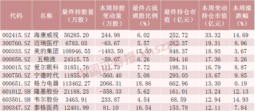 从持仓市值变动情况来看,本周北向资金对36只个股的持仓市值增加超过5亿元,对海康威视、迈瑞医疗、美的集团的持仓市值增加额居前,分别增加33.32亿元、19.31亿元、18.93亿元,其中北向资金加仓海康威视244.98万股,对迈瑞医疗、美的集团分别减仓63.67万股、1483.50万股。