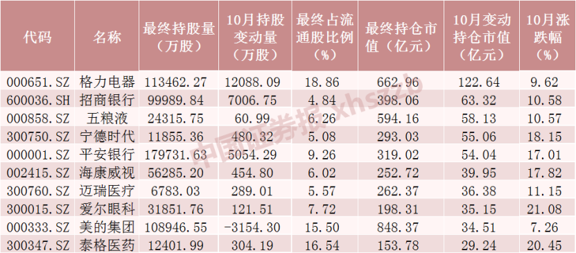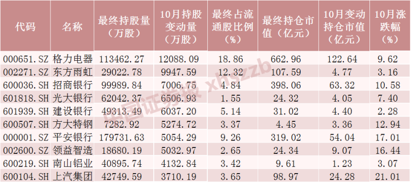 从持仓市值变动情况来看,Choice数据显示,10月以来北向资金对52只个股的持仓市值增加超过5亿元,其中对格力电器、招商银行、五粮液的持仓市值增加额居前,分别增加122.64亿元、63.32亿元、58.13亿元。