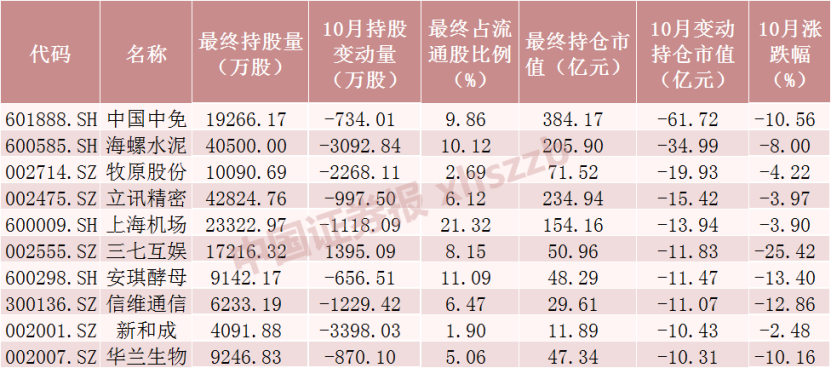 从持仓市值变动情况来看,10月北向资金对28只个股的持仓市值减少超过5亿元,对中国中免、海螺水泥、牧原股份持仓市值减少金额居前,分别减少61.72亿元、34.99亿元、19.93亿元。10月北向资金持仓市值减少额居前十个股除三七互娱被增持1395.09万股外均遭遇北向资金的减持,其中新和成被减持股数最多,达3398.03万股。