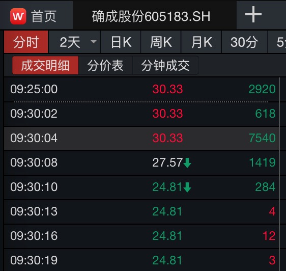 12月11日早盘,上市第五日的确成股份以涨停价开盘,但随即跌停。Wind数据显示,9:30:04,其股价仍在涨停板上,经历9:30:08的一笔平盘成交后,9:30:10就被打至跌停,整个过程仅用了6秒钟。