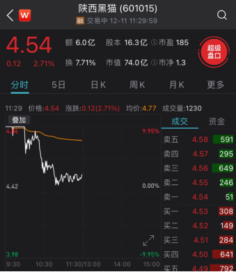 顺周期板块内,不少个股也感受到了从“天”到“地”的变化。其中,陕西黑猫开盘涨停,开盘15分钟后短线开板后继续保持涨停态势;临近10:00,股价跳水,随后震荡走低。截至午间收盘,陕西黑猫涨幅缩窄至2.71%。