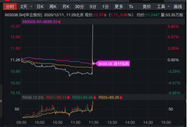 与确成股份开盘天地板相对应的是,华立股份临近午间收盘暴力拉升,从下跌逾4%到逼近涨停,不足90秒。