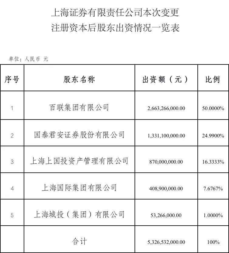 公告显示,增资完成后,百联集团出资额为26.63亿元,占比50%,国泰君安证券股份有限公司、上海上国资产管理有限公司为第二、第三大股东,分别持有24.99%及16.33%的股权。