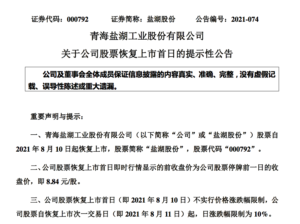 8月9日晚,*ST盐湖发布公告称,公司股票自2021年8月10日起恢复上市,股票简称“盐湖股份”。公告显示,*ST盐湖股票恢复上市首日的前收盘价为公司股票停牌前一日的收盘价,即8.84元/股。恢复上市首日不实行价格涨跌幅限制,次一交易日起日涨跌幅限制为10%。