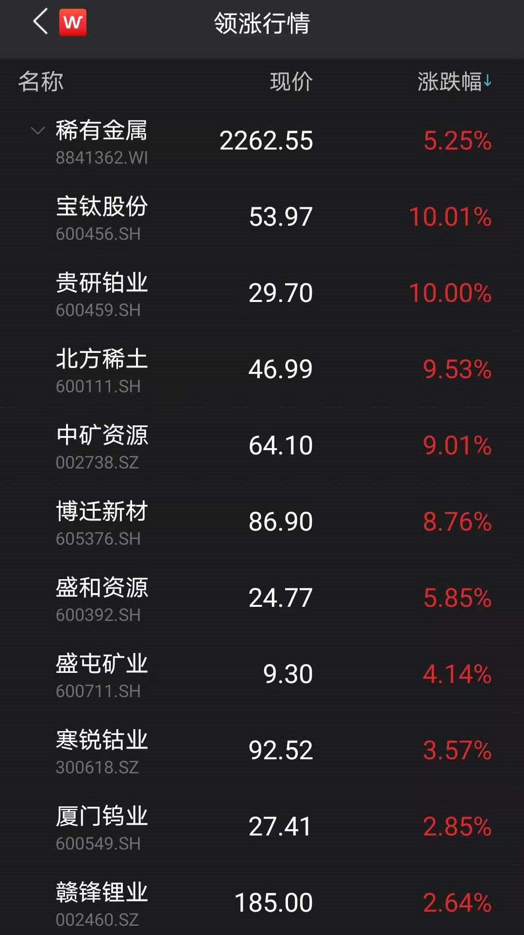稀有金属概念股今日也强势上涨。Wind数据显示,截至收盘,宝钛股份、贵研铂业双双涨停,中矿资源大涨逾9%,博迁新材、盛和资源、盛屯矿业等涨幅超4%。