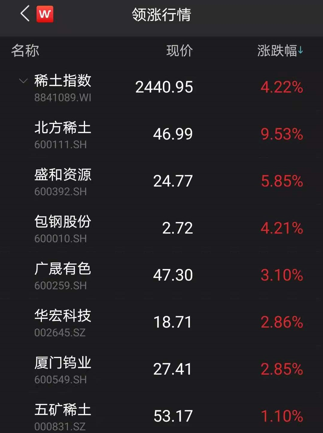 Wind数据显示,稀土指数大涨4.22%。成分股中,北方稀土大涨9.53%,今年以来涨幅超260%;盛和资源、包钢股份、广晟有色、华宏科技等跟涨。