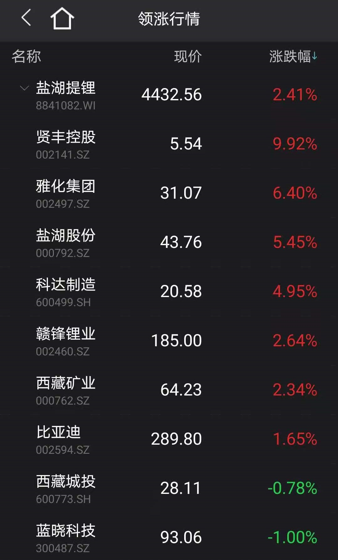 盐湖提锂板块今日也有不错表现。Wind数据显示,盐湖提锂指数今日上涨2.41%,成分股中贤丰控股拉升封板并创下近3年来新高,雅化集团上涨6.40%,科达制造、赣锋锂业、西藏矿业纷纷跟涨。