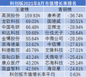 8月科创板市值增长率整体呈上涨趋势,增长率为0.63%,较前几月增长乏力,尽管如此科创板也已连续5个月实现正增长,累计增长率近34%。其中,141家科创板公司出现市值正增长,其余177家公司均出现不同程度的下降。