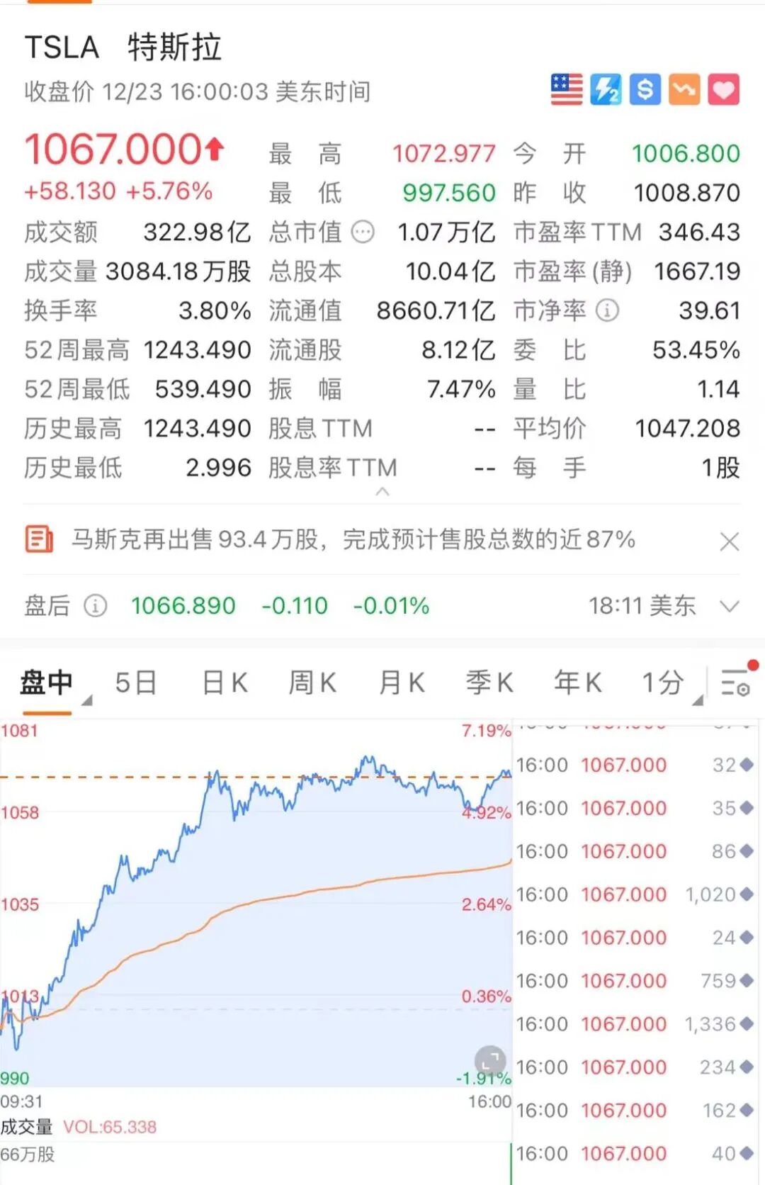 继周三特斯拉股价暴涨7.49%,股价站上1000美元大关之后;周四特斯拉再度上涨5.76%,最新收盘价为1067美元,总市值达到1.07万亿美元。