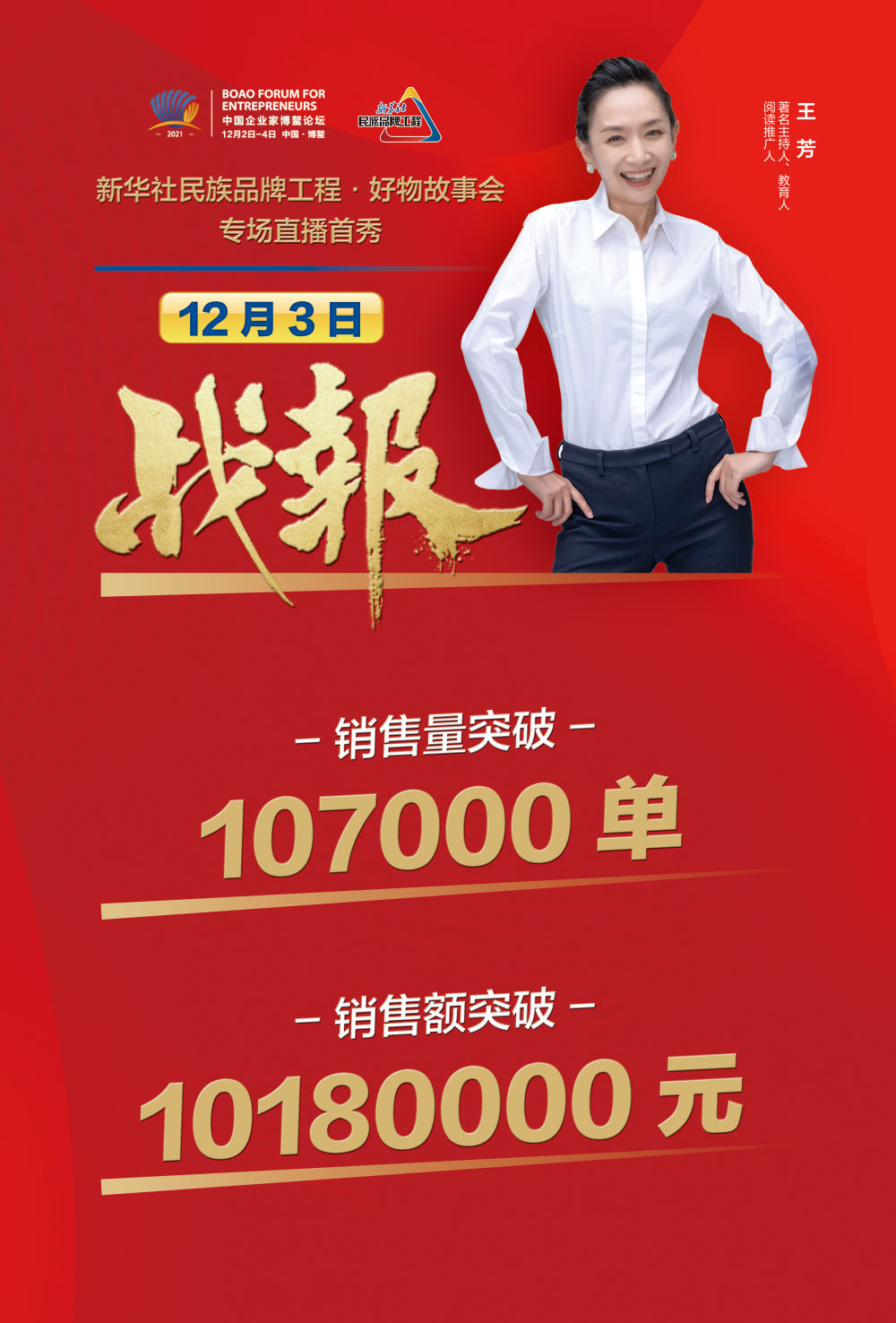 12月3日上午8时,首场“新华社民族品牌工程·好物故事会专场直播”活动在博鳌亚洲论坛国际会议中心正式举行。著名主持人、教育人、阅读推广人王芳作为“新华社民族品牌工程好物推荐官”在其抖音直播间领读新华出版社精品图书,短时间内聚合了大量人气。直播中,王芳倾情推荐生活、食品、文教、图书等多个品类,全场销售额10180000元,销售量107000单。其中首轮亮相王芳直播间的新华版图书《一起去看冬奥会》《小小演说家》短短时间内全部售罄;《新华通讯社90 年90 篇精品选》《七岁开始的哲学思想启蒙》《勋章:共和国不会忘记》等图书累计销售近千册。3日下午18时,为期一天的直播活动完美收官。(林郁郁)