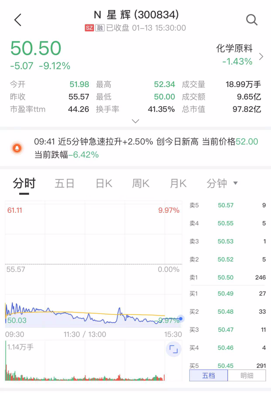 今日,N星辉下跌9.12%,全天成交9.65亿元,市值为97.82亿元。以N星辉收盘价计算,中一签亏损金额达2535元。