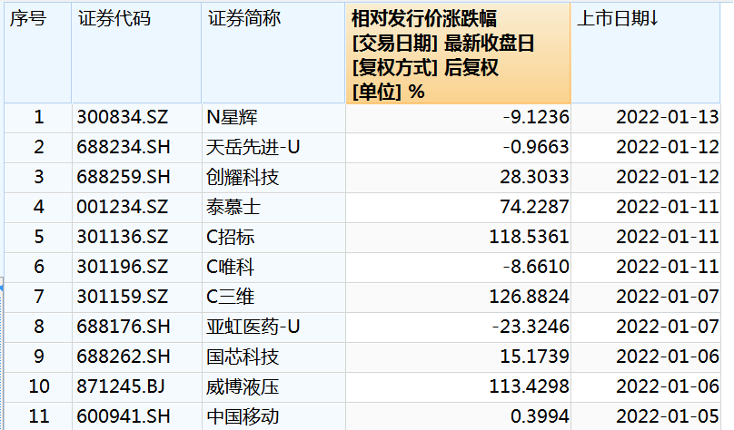 今日又有一只新股——N星辉破发了,1月以来上市的11只新股中,已有亚虹药业-U、C唯科、天岳先进-U、N星辉破发,破发率达36.36%。其中,亚虹药业-U破发最为严重,相较发行价跌幅达23.32%。