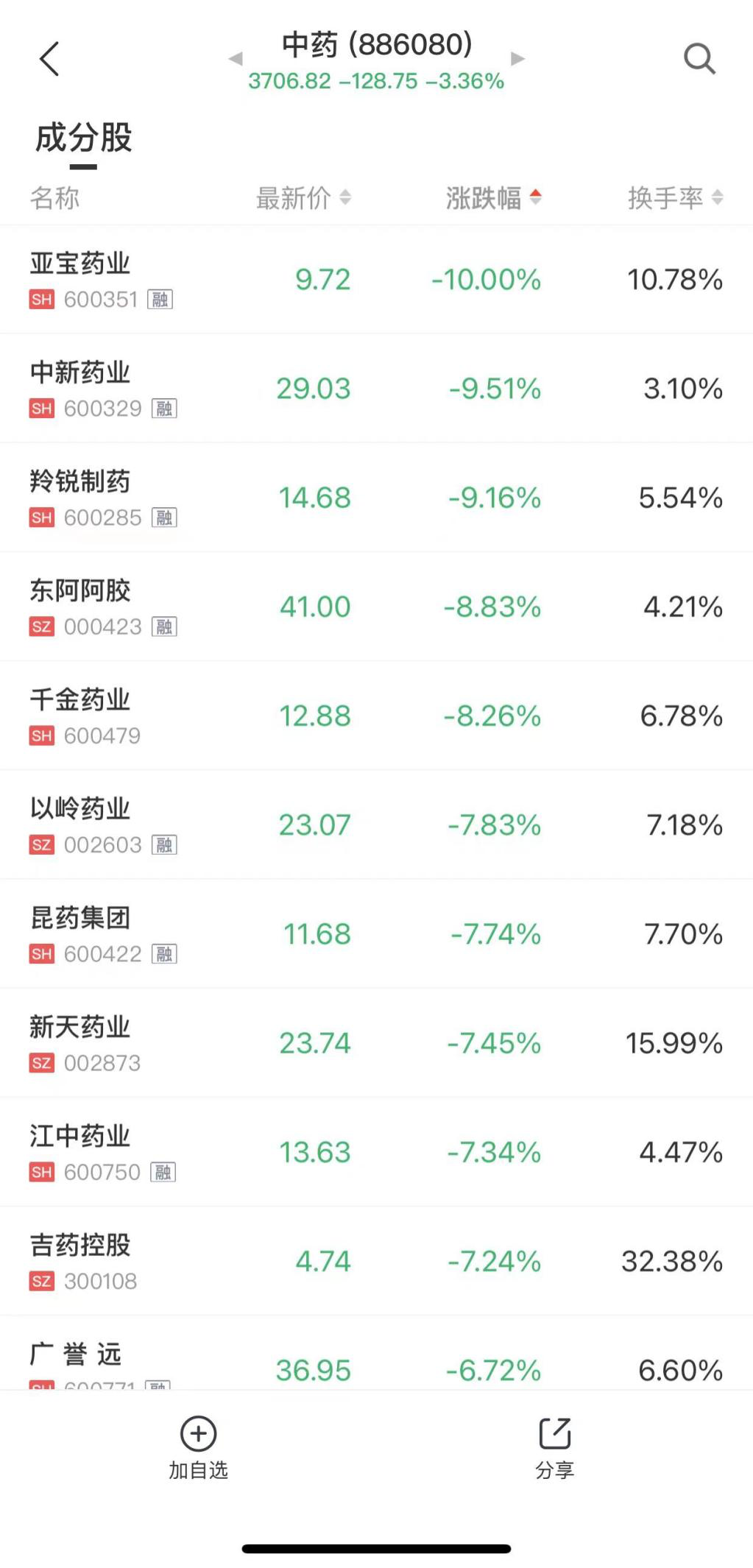 除白酒板块大跌外,近期走势强劲的中药板块也大跌,板块内亚宝药业跌停,中新药业、羚锐制药跌逾9%,东阿阿胶、千金药业跌逾8%。