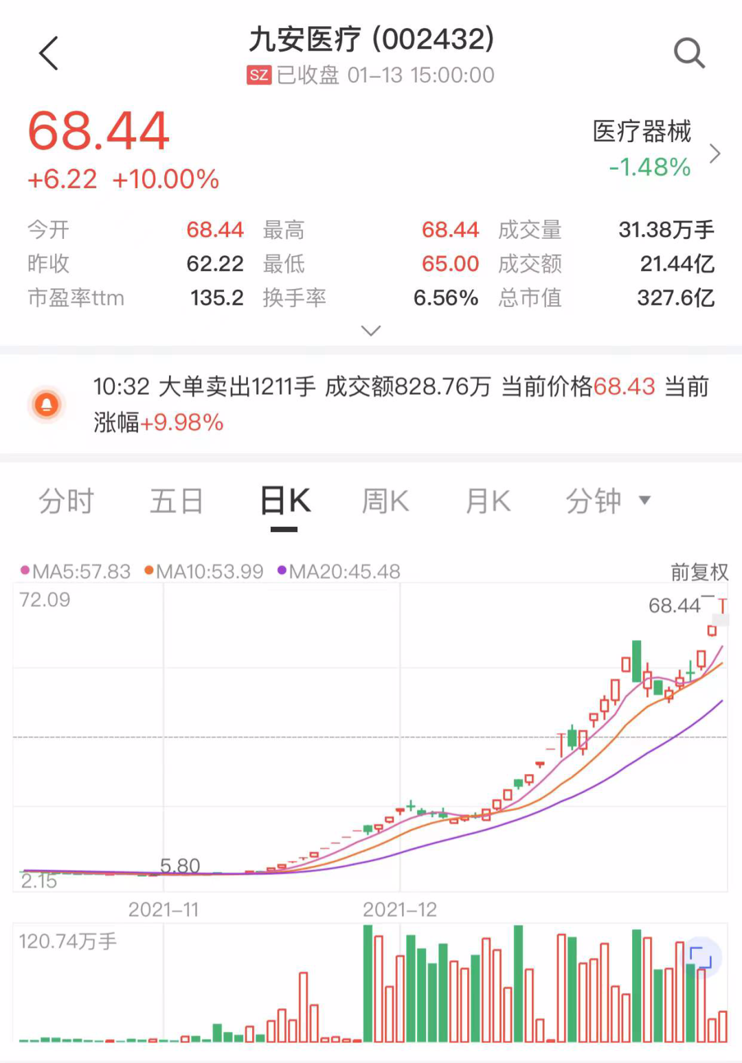 今日,10倍大牛股九安医疗再度涨停,出现“三连板”,也是近两个月第26个涨停。从2021年11月5日的最低价5.99元/股到今日收盘价68.44元/股,在短短2个多月的时间里,九安医疗累计涨幅达1042.57%,市值增加到327.6亿元。