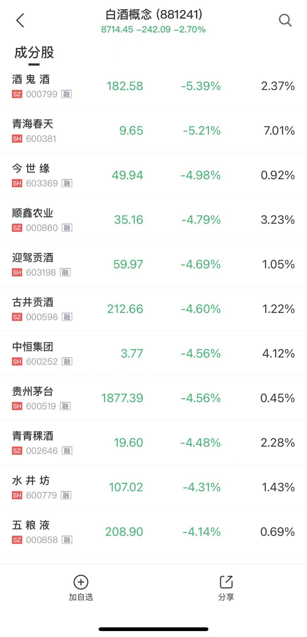 白酒板块领跌市场,舍得酒业跌逾6%,酒鬼酒跌逾5%,贵州茅台、五粮液等跌逾4%。其中,贵州茅台创近3个月最大跌幅,全天成交额为107.8亿元,市值为23584亿元,今日市值蒸发1129亿元。