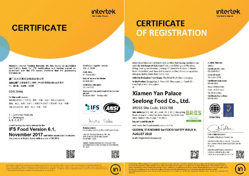 图:燕之屋获得BRC、IFS欧洲品质双认证