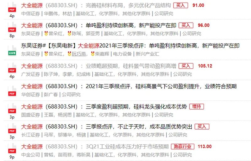 其中中信证券预计,大全能源2021年净利润为72.4亿元,给予公司2022年20倍PE估值,上调目标价为91元,维持“买入”评级。
