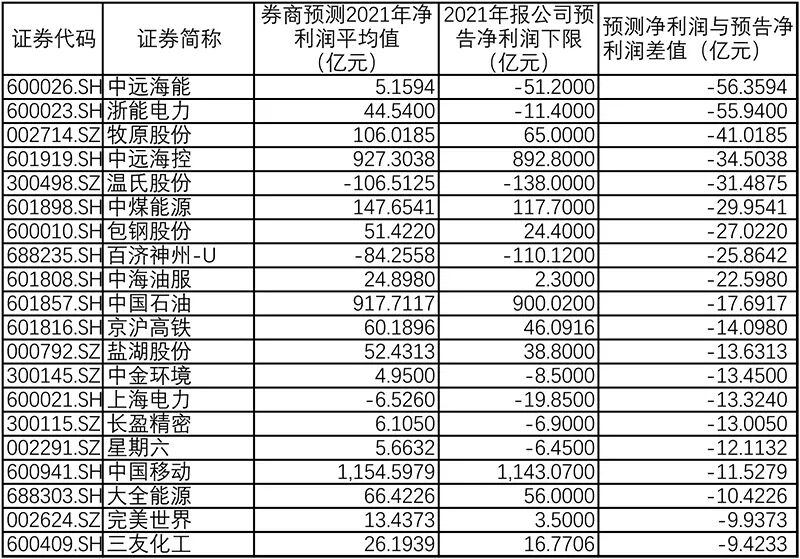 下表为Wind数据中,2021年年报净利润(下限)与此前券商预测净利润平均值相差较大的20家公司。